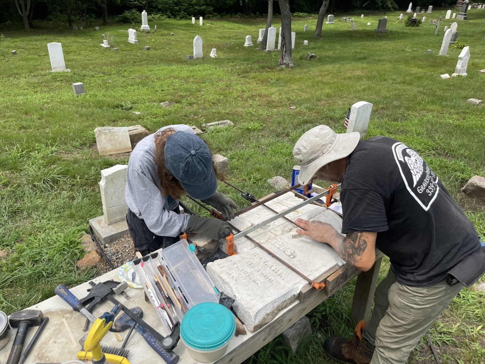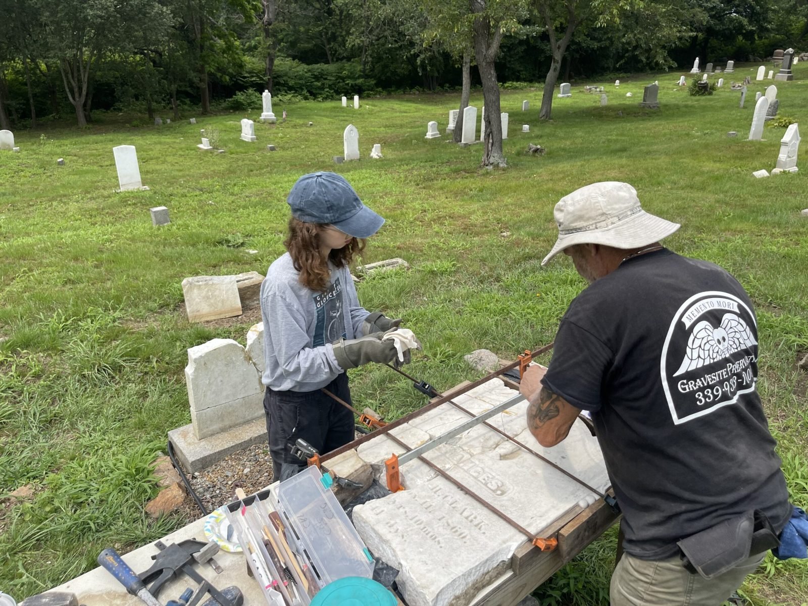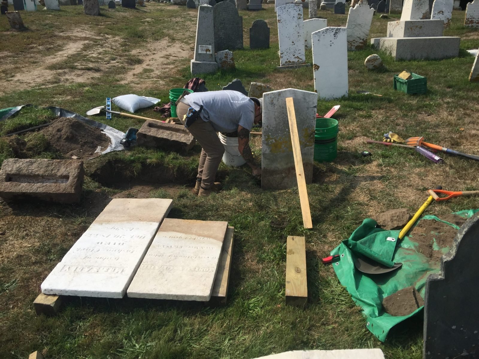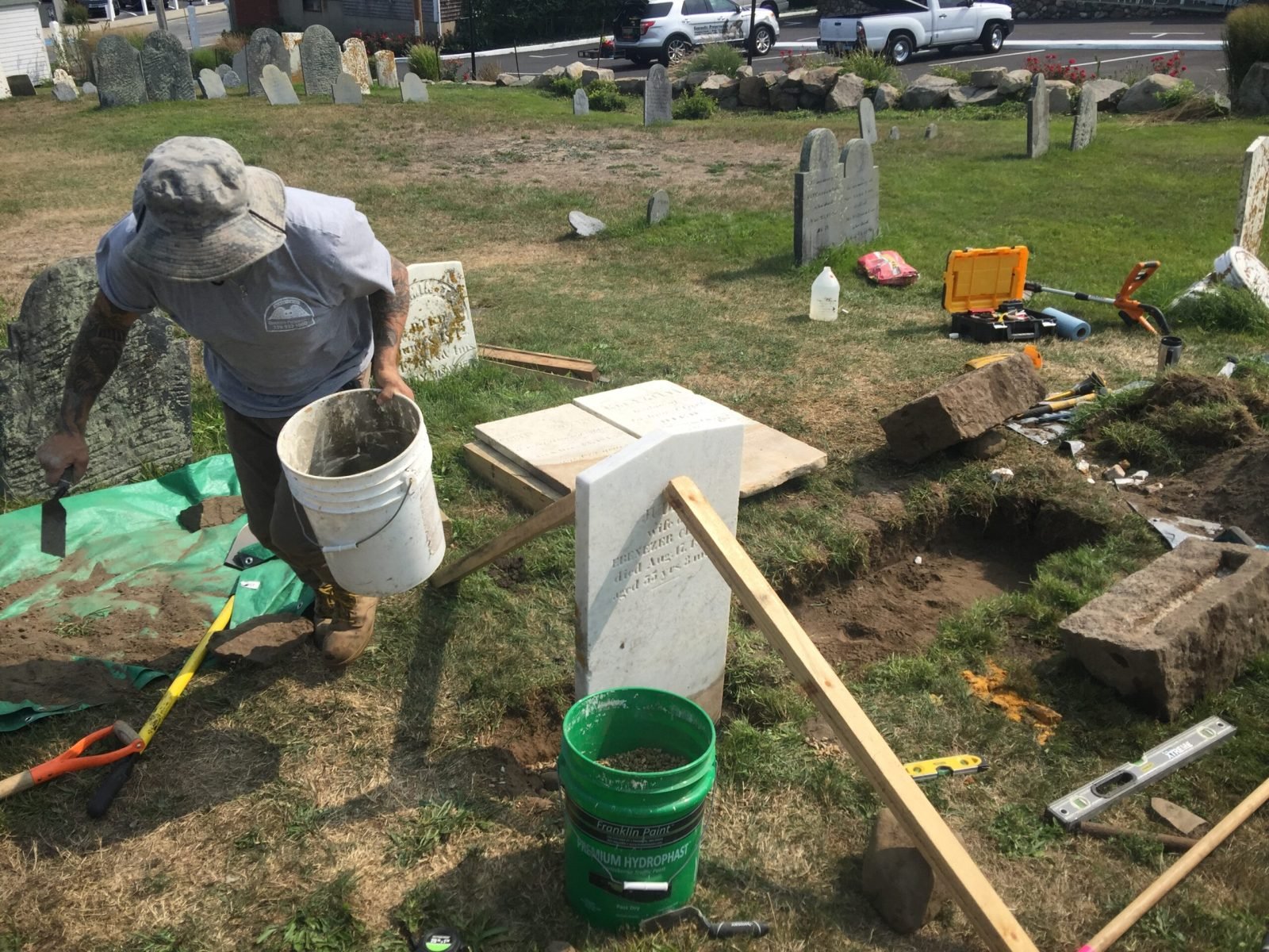 Jonathan Appel is the owner of Atlas Preservation in Southington, CT. He held a cemetery conservation workshop at First Parish Burial Ground in Gloucester, MA, on August 14th. Many of the local cemetery volunteers were there to assist in the workshop. Rob Surabian owner of Gravesite Preservation in Winchester, MA, was in attendance to support the Atlas Preservation projects taking place by the workshop attendees. Â