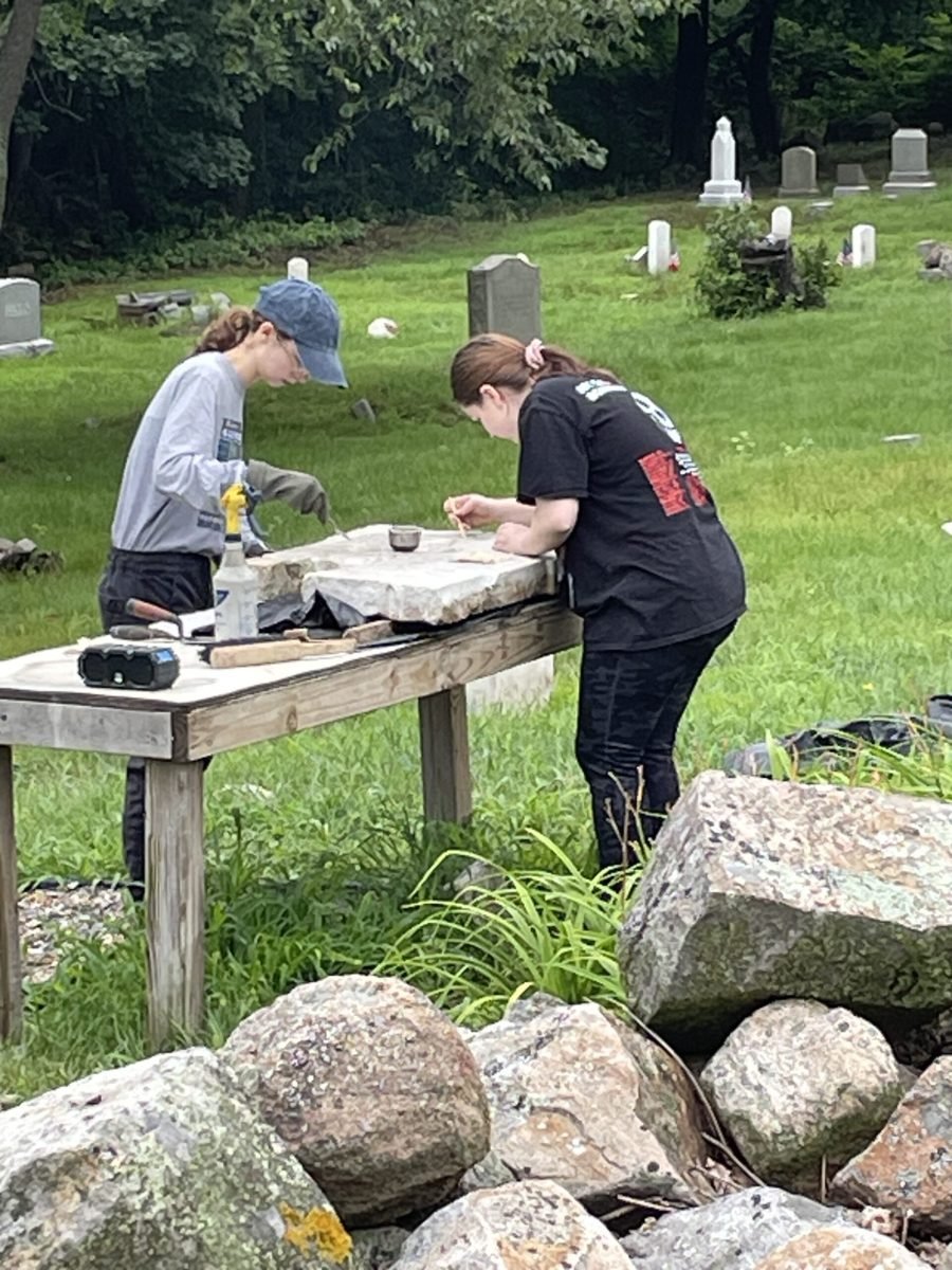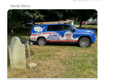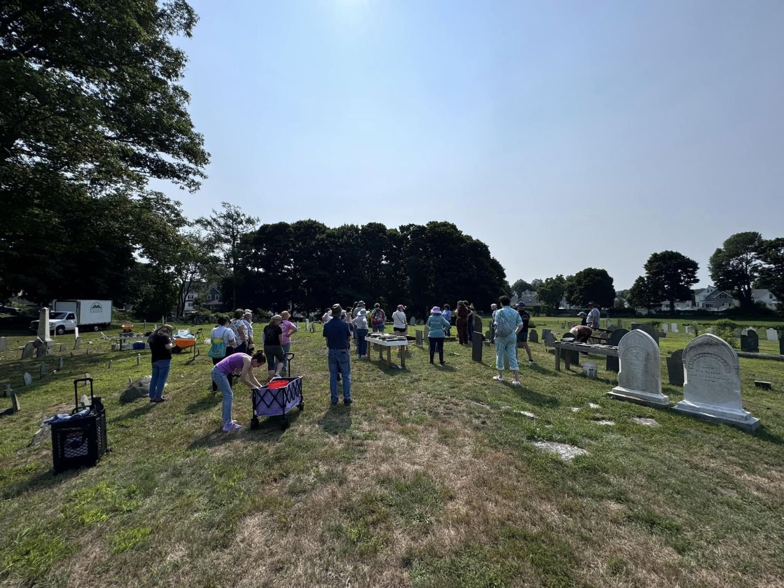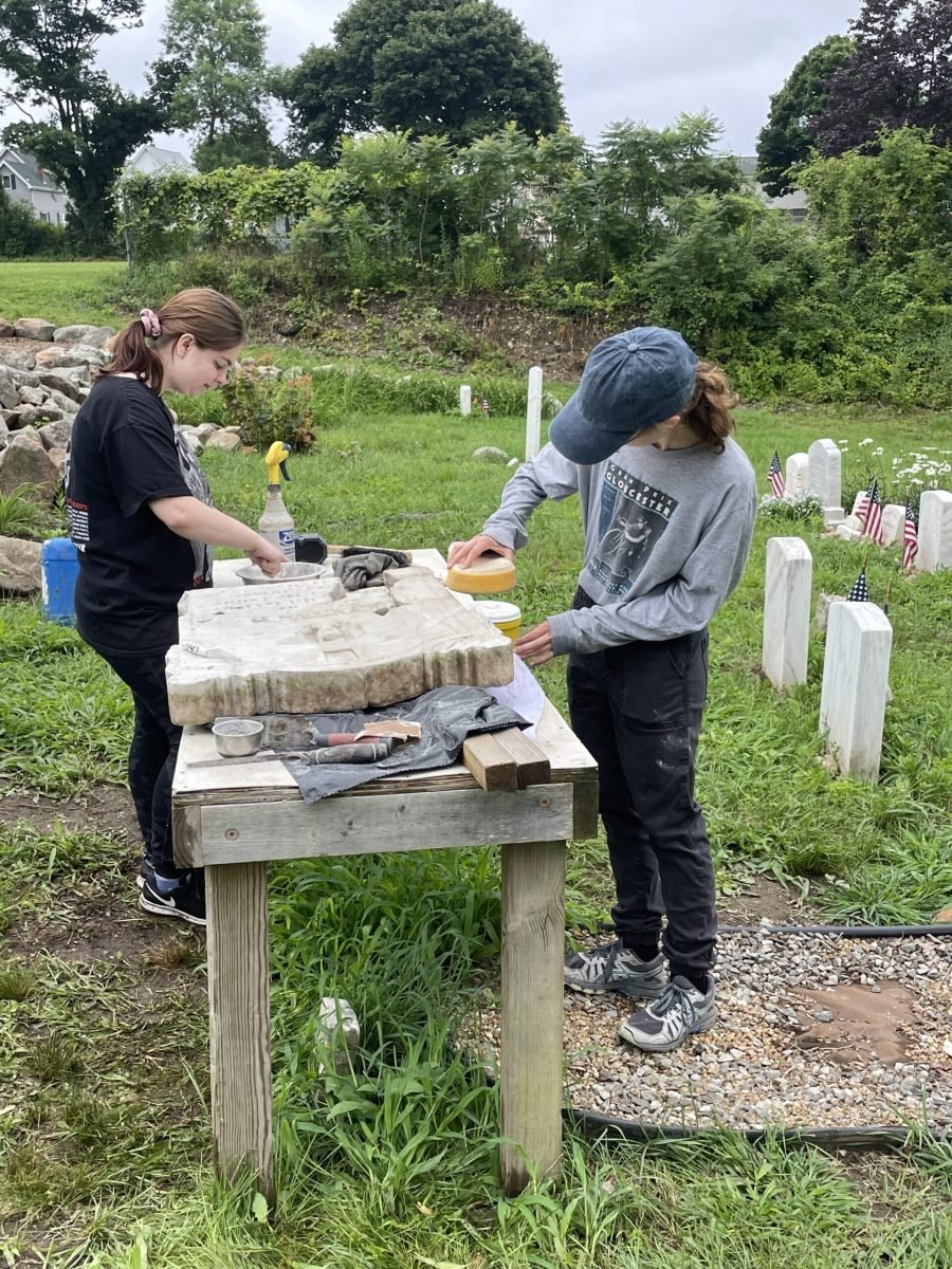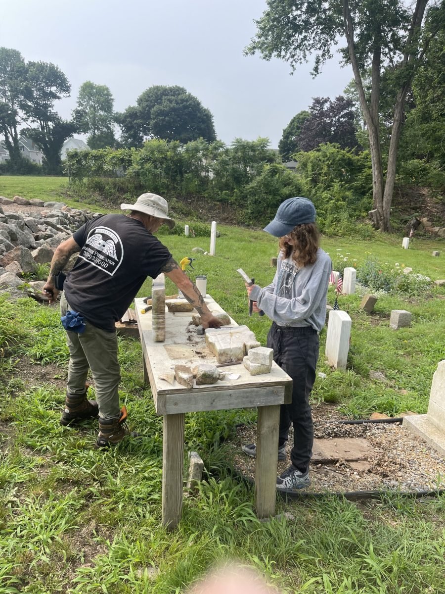 Jonathan Appel is the owner of Atlas Preservation in Southington, CT. He held a cemetery conservation workshop at First Parish Burial Ground in Gloucester, MA, on August 14th. Many of the local cemetery volunteers were there to assist in the workshop. Rob Surabian owner of Gravesite Preservation in Winchester, MA, was in attendance to support the Atlas Preservation projects taking place by the workshop attendees. Â