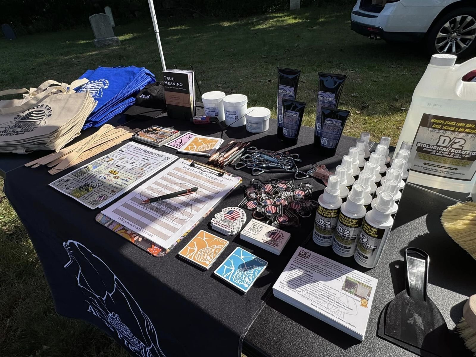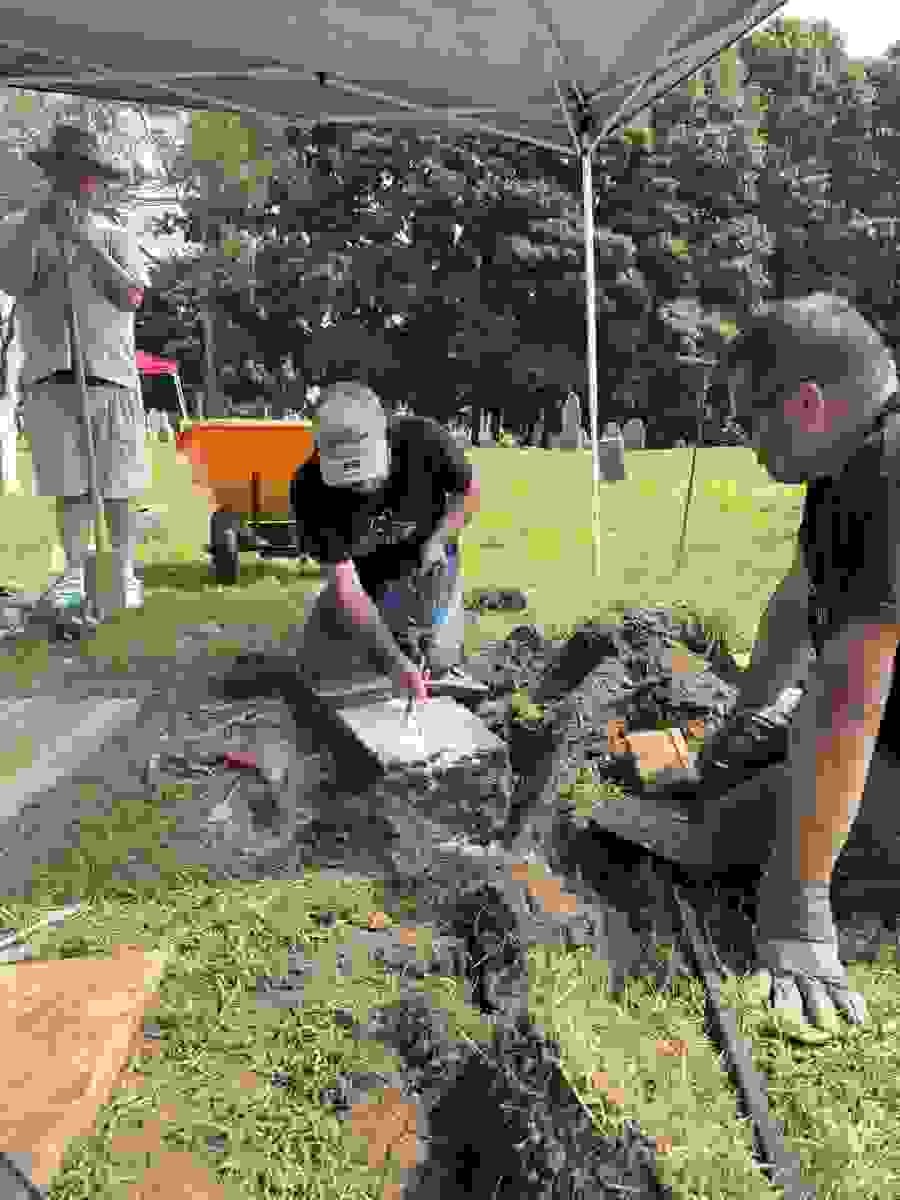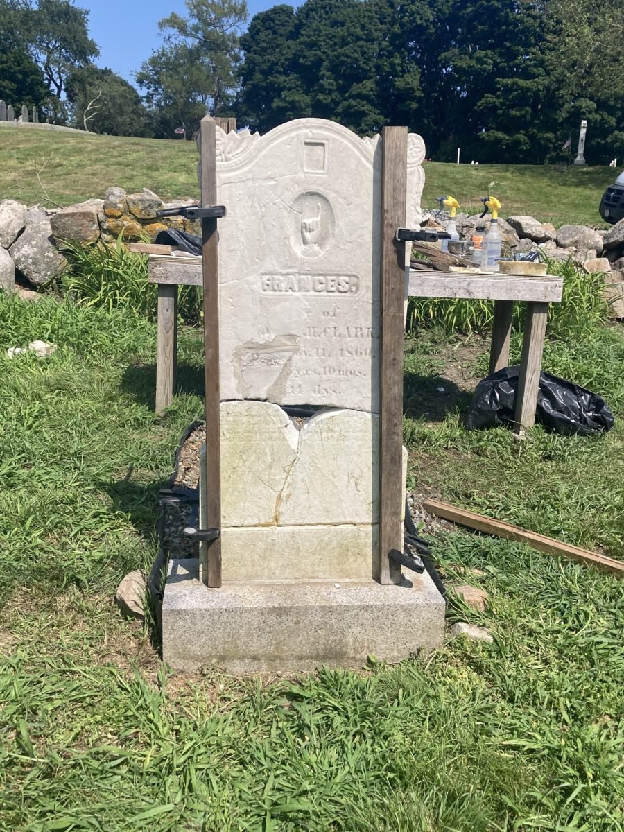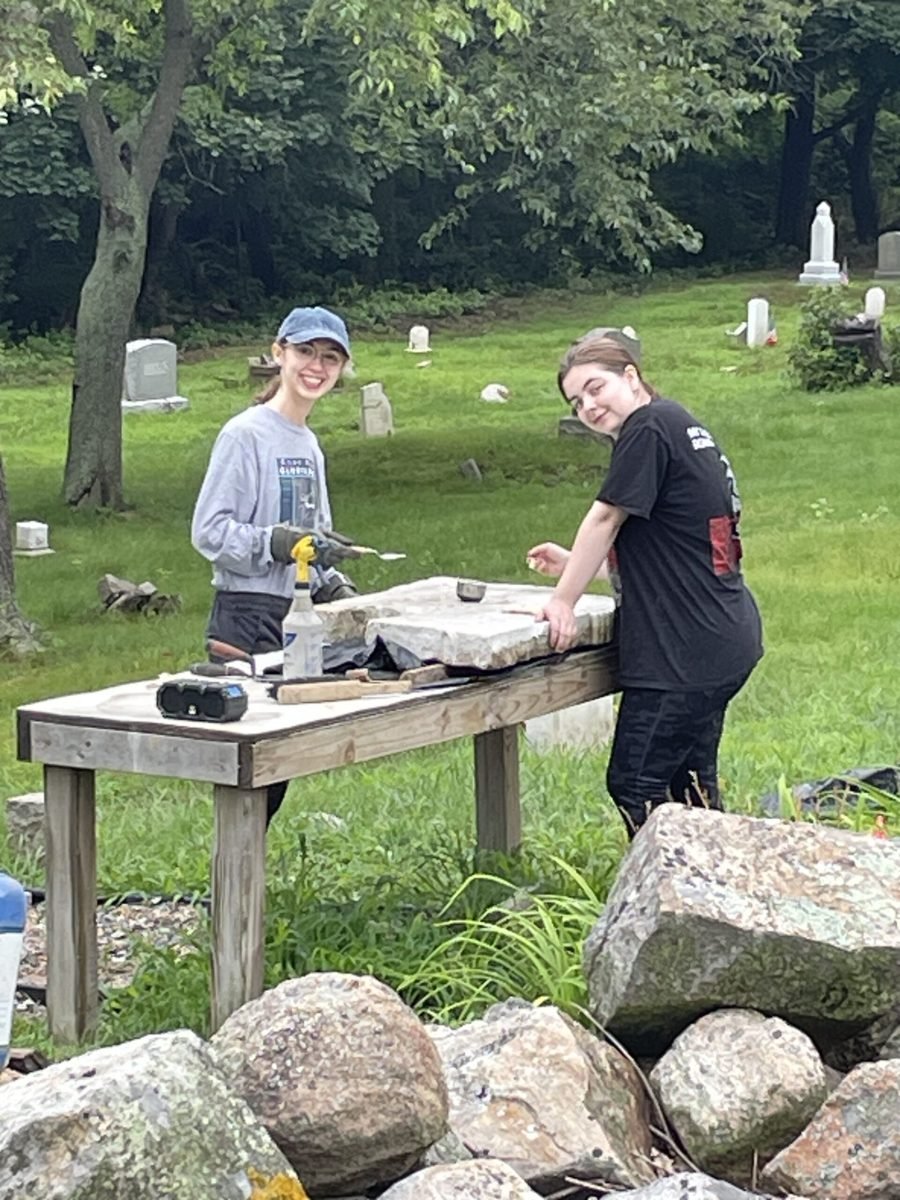 Jonathan Appel is the owner of Atlas Preservation in Southington, CT. He held a cemetery conservation workshop at First Parish Burial Ground in Gloucester, MA, on August 14th. Many of the local cemetery volunteers were there to assist in the workshop. Rob Surabian owner of Gravesite Preservation in Winchester, MA, was in attendance to support the Atlas Preservation projects taking place by the workshop attendees. Â